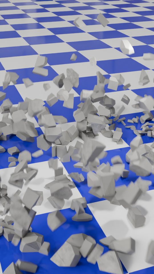 For each of the animations I changed the number of pieces that the wall would be broken into. This is the essence of the video, and was simply a matter redoing the wall break-up (takes a few seconds) and then rendering the animation (about 10 minutes for each part).