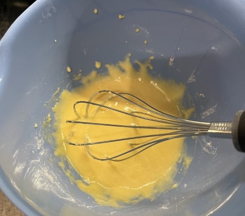 Gradually pour the hot milk onto the sugar mixture, whisking constantly. Two of us did this together (I had help from younger daughter, who made crème anglaise in Food Tech at school); she poured and I whisked.