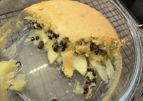 Put the sponge mix on top of the apples. Make sure it’s covering the apples, then pop it in the oven for 40 to 50 minutes.