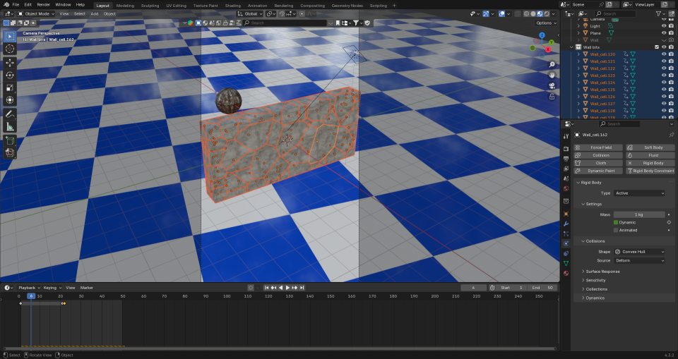 The use of ‘dynamic paint’ added an extra layer. Here, the laser beam is made to act like a brush and ‘paint’ a red glow on the cut surfaces of the cube. This is made to fade over a short time but it looks like the pieces are heated up by the laser then cool down.