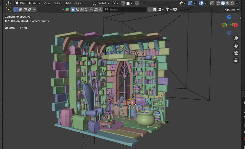To make the thing more my own, I changed a few things. First, the path that the laser takes is changed to go above the cube. Second, a vase is positioned and cut by the laser. Then background bits – a marble slab for the vase to sit on and a few more vases to fill out the scene.