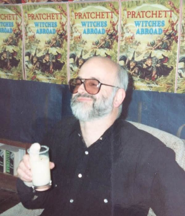 Pterry at Loughborough University, signing for Witches Abroad in 1992. Our friend Emma and I colluded to get him a bananana dakry which, to his credit, he drank and pretended to enjoy.