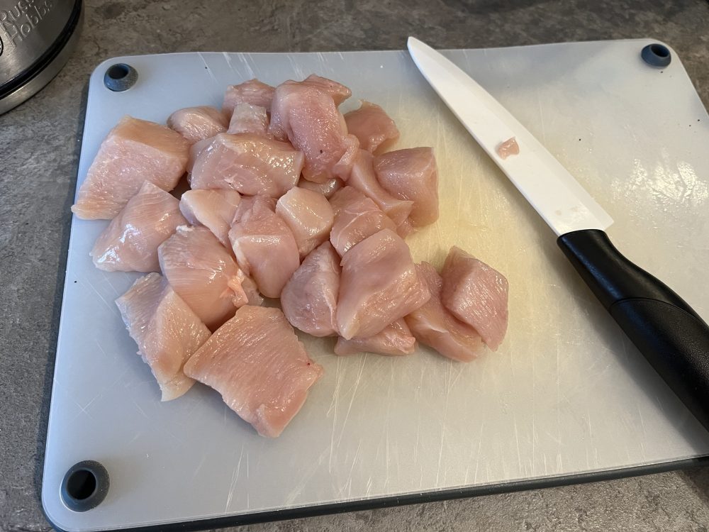 Diced chicken on a chopping board.